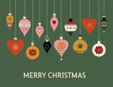 Christmas ornaments on green background with decorative festive patterns