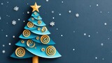 Blue Christmas tree with golden spirals and star topper in a snowy festive scene