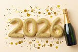 Golden 2026 celebration with glitter numbers and champagne bottle for New Year