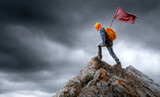 Hiker with backpack climbing a peak under dramatic clouds with a red flag