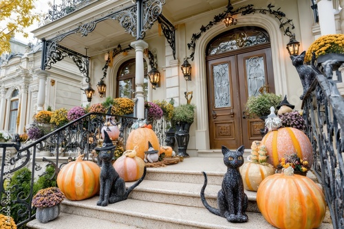 Cozy watercolor house with pumpkins and autumn foliage decorations