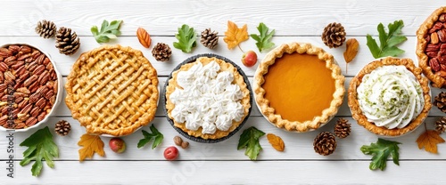 Assorted festive pies on a decorative table with autumnal accents and pinecones