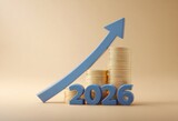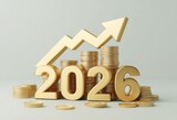 Golden 2026 year and coins with an upward arrow symbolizing economic growth