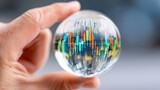 Hand holds glass sphere showing stock market forecast with colorful data charts for finance imagery