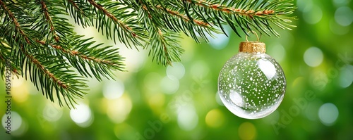 Close-up of Christmas tree branch with glass ornament and green bokeh