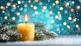 Yellow candle surrounded by snowy branches with a glowing festive background