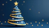 Blue Christmas tree with golden ribbons and star topper in a festive holiday scene