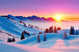 Beautiful winter sunset over snowy mountain landscape with trees