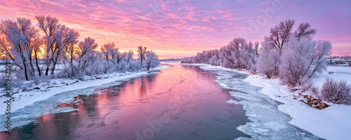 Beautiful winter sunset over a serene icy river landscape