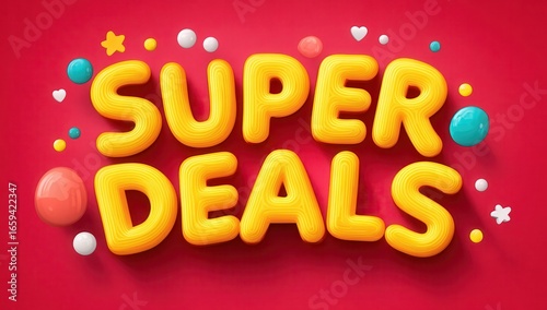 Colorful super deals text with vibrant font and playful background elements