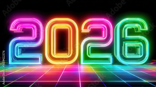 Bright colorful futuristic design showcasing the year 2026 in neon letters
