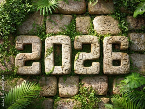 The year 2026 displayed on stone surrounded by vibrant green plants