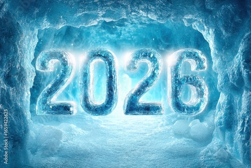 The year 2026 represented in glowing ice crystals within a winter cave