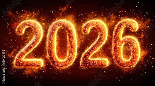 Glowing fiery digits display the year 2026 with radiant lava-like effect