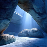 Underwater scene with sunlight illuminating a pebble-covered ocean floor