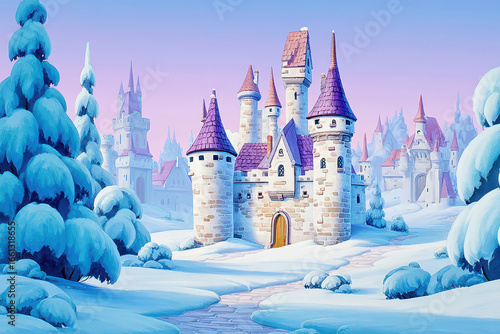 Fantasy snow-covered castle in a serene winter setting at dusk