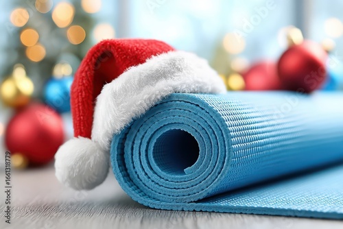 Blue yoga mat with Santa hat and Christmas decorations indoors