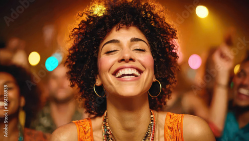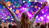 Woman celebrating at vibrant outdoor festival with colorful lights and crowd