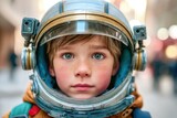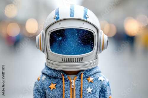 Child wearing astronaut helmet with space reflection in a colorful setting