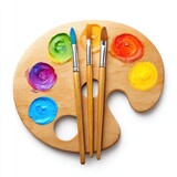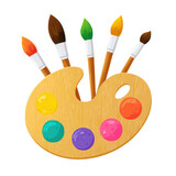 PNG wooden art palette with brushes and colorful paints for creative painting