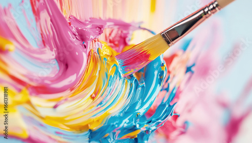 Close-up of colorful paint strokes on canvas with a paintbrush