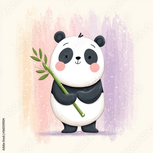 Cute panda holding bamboo on colorful pastel background