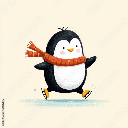 Adorable penguin wearing a scarf ice skating joyfully on a wintery day