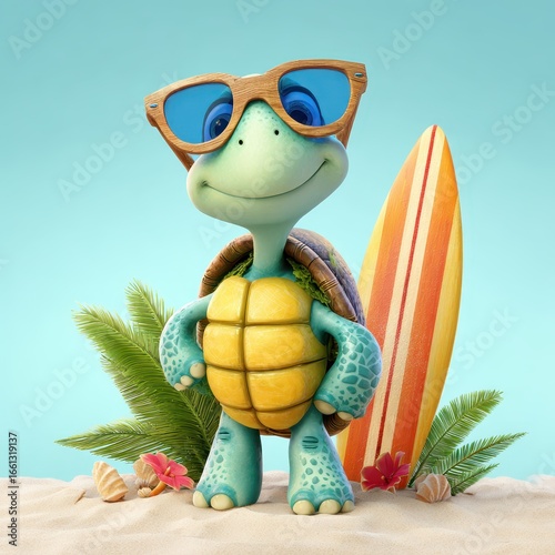 Smiling turtle with sunglasses enjoying the beach near a colorful surfboard