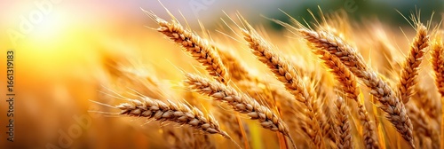 Golden wheat stalks in a blurred outdoor background with warm sunlight