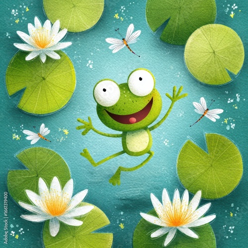 Happy frog leaping among lily pads and dragonflies in a cheerful pond