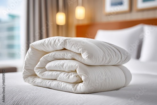 Neatly folded white duvet on a bright, comfortable bed in natural light