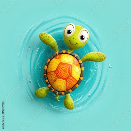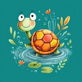 Cute smiling turtle in vibrant pond surrounded by greenery and bubbles