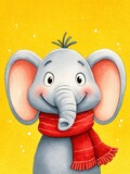 Adorable cartoon elephant wearing red scarf on a bright yellow background