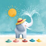 Cute elephant splashing water outdoors wearing a hat with bright summer colors