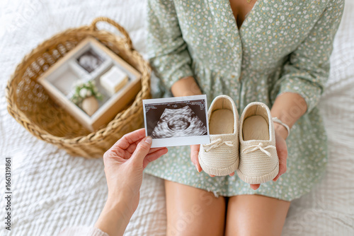 Pregnant woman holding ultrasound photo and baby shoes on a cozy bed