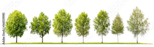 Set of three large sycamore platanus trees displayed against a clean white background for graphic design or nature projects
