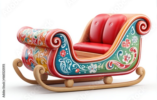 Handcrafted colorful wooden sleigh with intricate floral designs and red seats