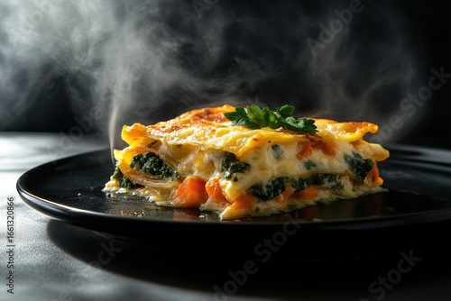 Steaming plated vegetarian lasagna with fresh garnish and smoky background