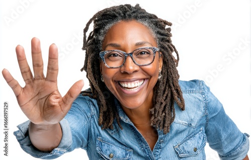 Smiling woman with glasses and outstretched hand in casual denim outfit