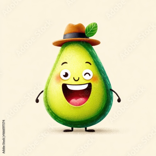 Cheerful cartoon avocado with a hat and a happy smiling expression