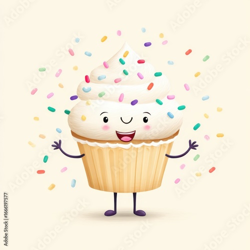 Adorable cartoon cupcake with sprinkles showcasing charm and joy