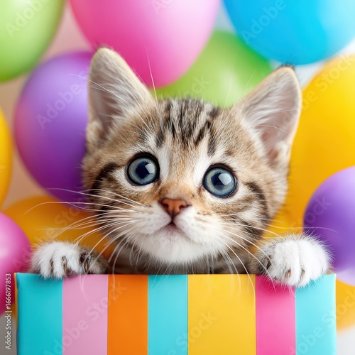 Cute kitten peeking from colorful box surrounded by cheerful party balloons