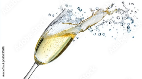 Champagne glass spilling with splash isolated on white background