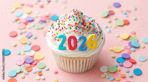 Colorful sprinkles cupcake with 2026 numbers on a pink celebratory background