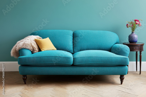 Modern teal sofa with yellow cushion and cozy decor in stylish living room