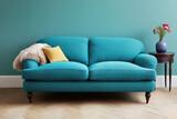 Modern teal sofa with yellow cushion and cozy decor in stylish living room