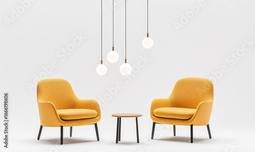 Two modern chairs against vibrant yellow wall in stylish room