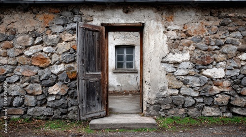 Entrance of rustic stone building with open wooden door and outdoor scenery.