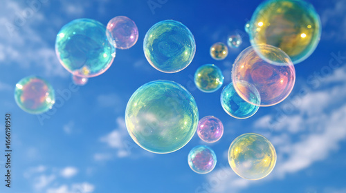 Colorful soap bubbles floating in a bright blue sky with fluffy clouds
