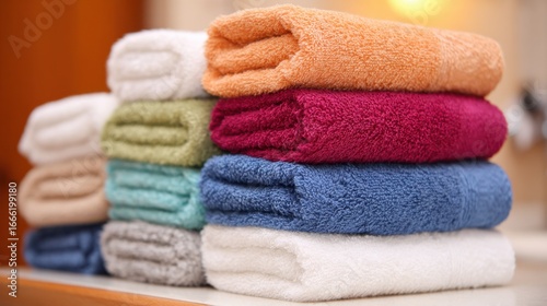 Stack of folded colorful towels arranged on a table in a cozy setting